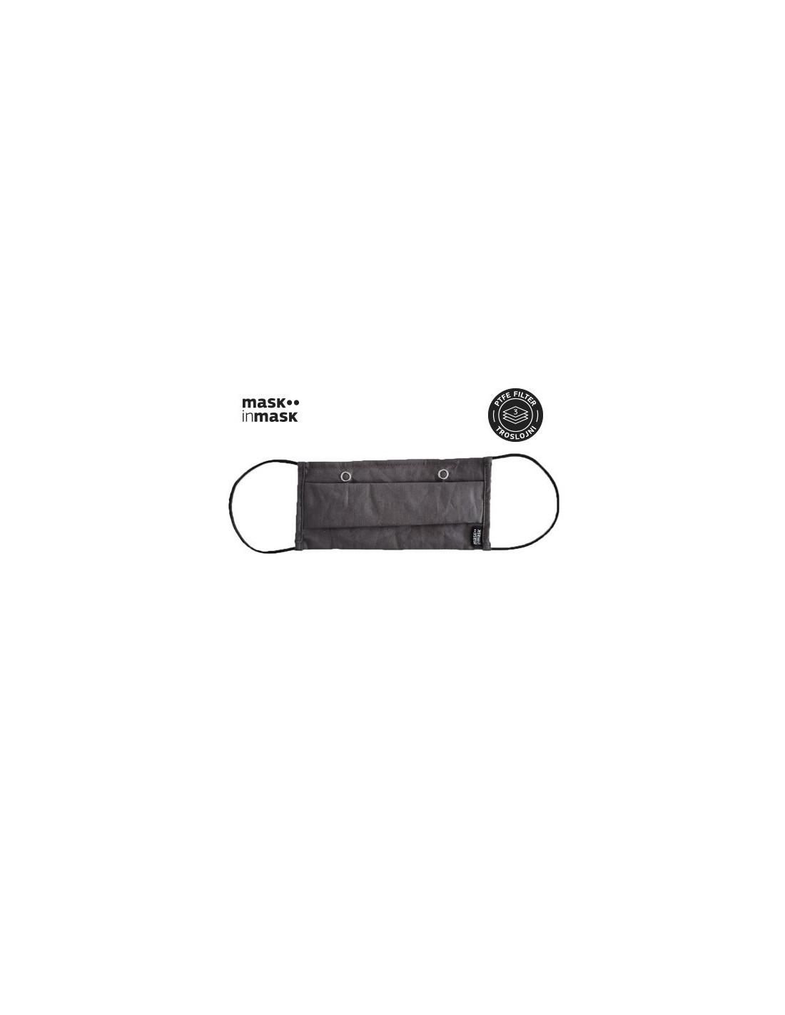 MASK in MASK. Maska u masci koja se sastoji od vanjske, platnene maske i troslojnog PTFE filtera sa učinkovitosti filtracije bakterija (BFE) od 99,2% i učinkovitosti filtracije čestica (PFE) od 97%.